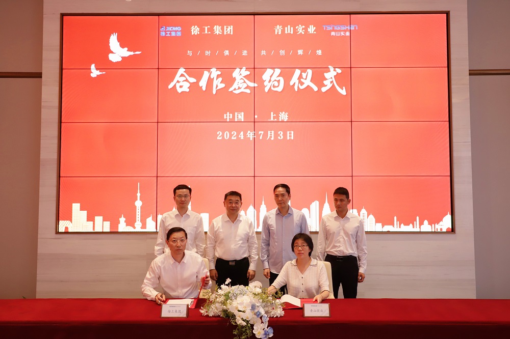 7月3日下午,青山实业与徐工机械合作协议签约仪式在上海董事局总部举行。徐工集团、徐工机械董事长、党委书记杨东升,青山实业董事局主席项光达出席并见证签约。青山实业主席助理黄亚敏、徐工机械董秘费广胜代表双方签订合作备忘录。